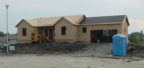 A view of the front. Most of the plywood sheathing is on. The